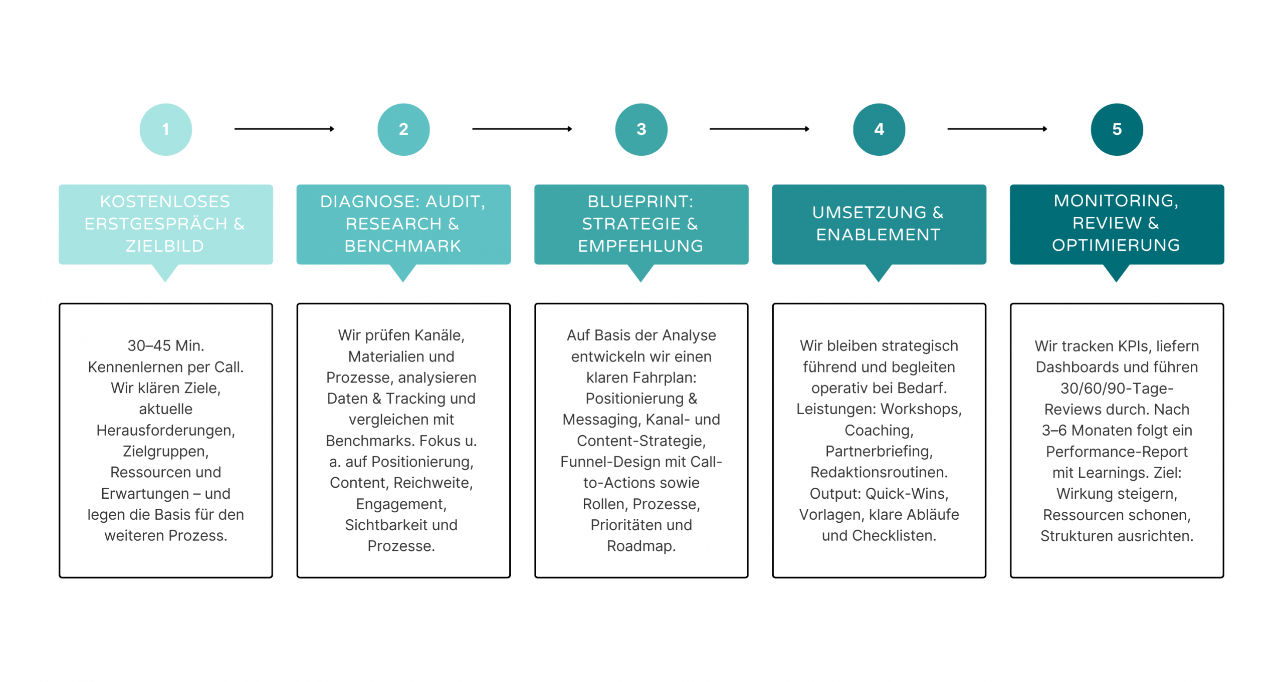 Ob nur Strategie oder auch Begleitung in der Umsetzung: Sie entscheiden, wie weit wir mitgehen. Unser Prozess passt sich Ihren Ressourcen an.